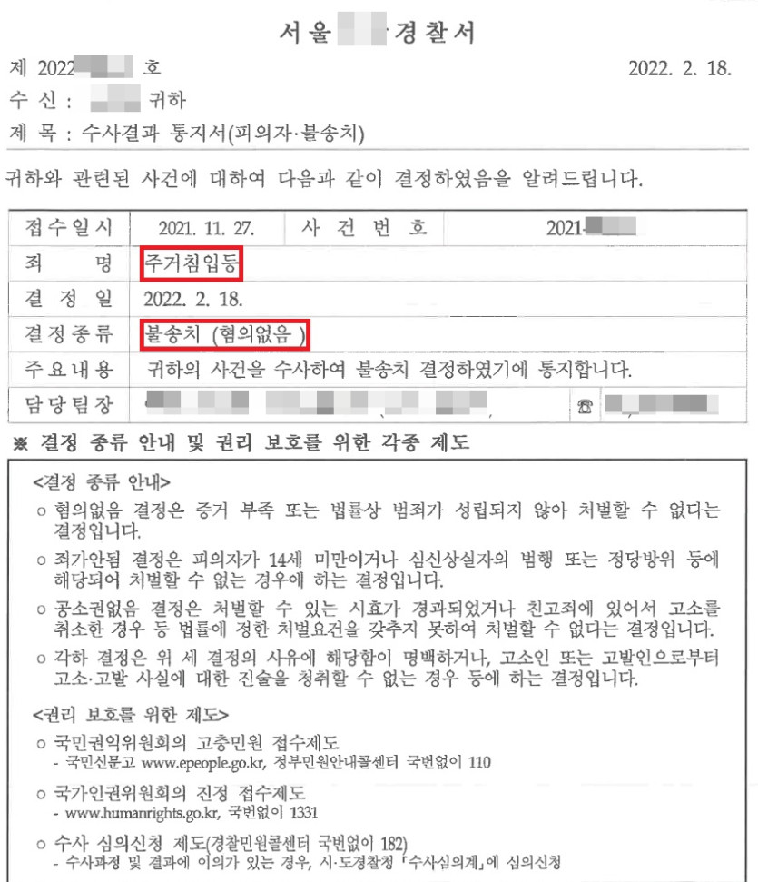 그러나 안성열 김범기 변호사는 해당 스토킹 행위에 정당한 이유가 있음을 변호인의견서를 통해 객관적 증거로 증명함. 이러한 주장이 받아들여져 경찰단계에서 무혐의 결정을 받았음.