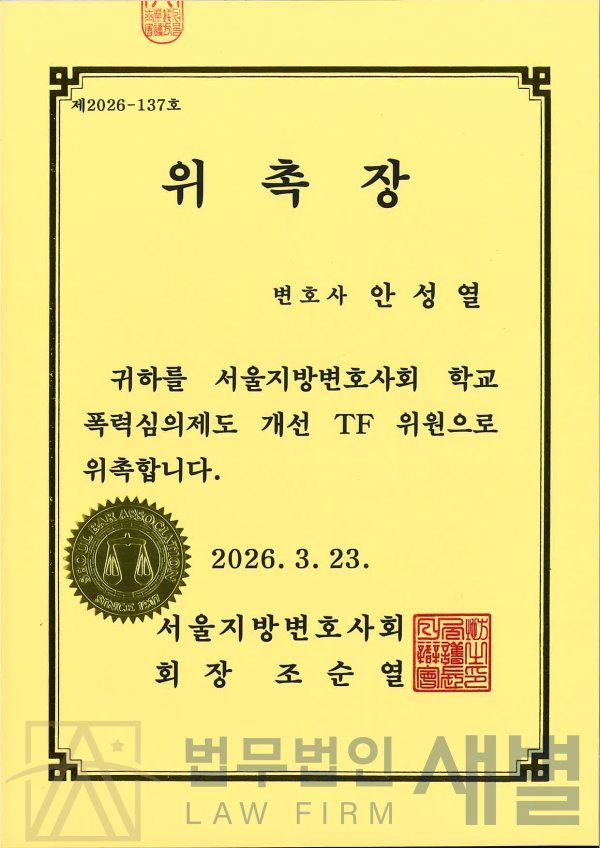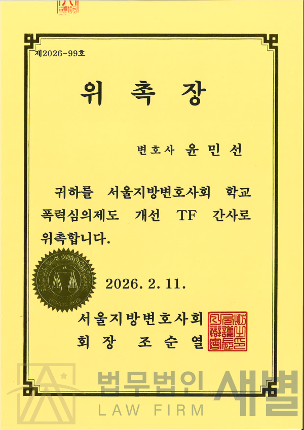 서울지방변호사회 학교폭력심의제도 개선 TF 페이지 정보 최고관리자 작성일26-03-24 목록 본문 안성열 대표변호사님이 서울지방변호사회 학교폭력심의제도 개선 TF 위원으로 위촉되었습니다. 윤민선 변호사님이 서울지방변호사회 학교폭력심의제도 개선 TF 간사로 위촉되었습니다. 목록